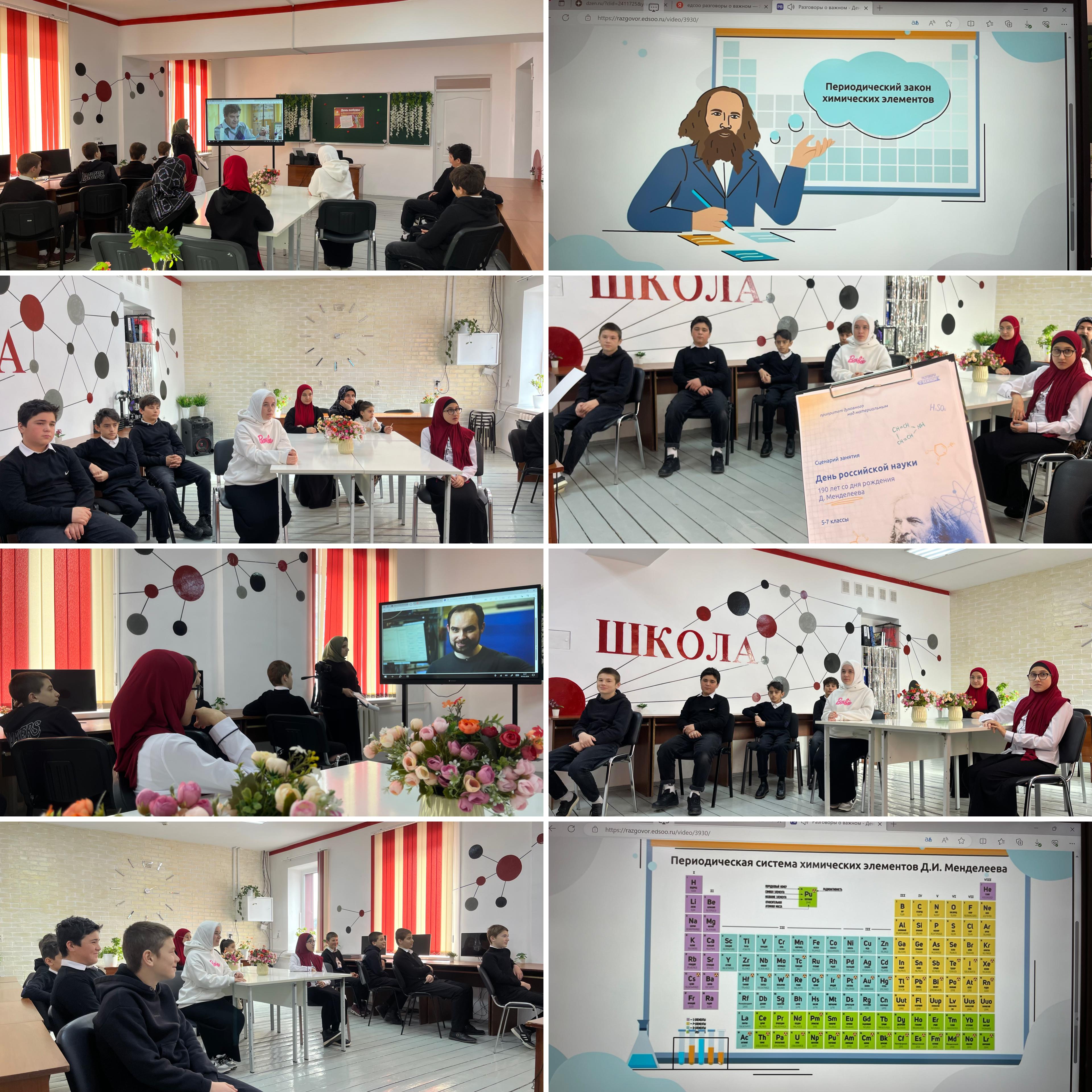 Классные руководители рассказали ребятам об изобретениях великого химика, о современных достижениях российских учёных, об открытии новых материалов, создании новых технологий, разработке устройств, облегчающих жизнь человека. В конце занятия обучающиеся подвели итог. Наука, помогает познать мир, бороться с болезнями, изменением климата, исследовать новые технологии — и делает нашу жизнь комфортнее.